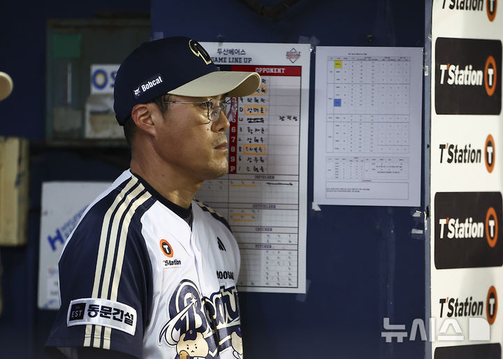 [서울=뉴시스] 김근수 기자 = 조성환 두산 베어스 감독 대행이 24일 서울 송파구 잠실야구장에서 열린 프로야구 '2025 신한 SOL 뱅크 KBO리그' KT 위즈와 두산 베어스의 경기를 지켜보고 있다. 2025.08.24. [email protected]