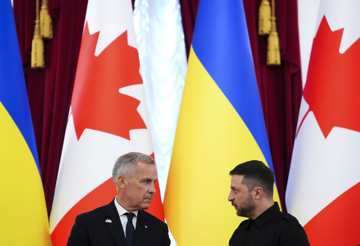 [키이우=AP뉴시스] 마크 카니(왼쪽) 캐나다 총리와 볼로디미르 젤렌스키 우크라이나 대통령이 24일(현지 시간) 우크라이나 키이우 마린스키궁에서 방위협정을 체결하고 있다. 카니 총리는 "우크라이나군만의 힘으로 안전을 보장하는 것은 비현실적"이라며 "병력 주둔 가능성도 배제하지 않는다"라고 밝혔다. 2025.08.25.