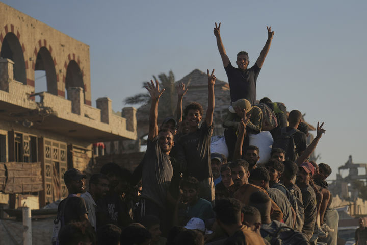 [가자시티=AP/뉴시스] 24일(현지 시간) 가자지구 북부에서 가자시티에 도착한 인도적 지원 물품 수송 트럭에서 내린 밀가루 자루를 나르는 팔레스타인 주민들이 카메라를 향해 손을 흔들고 있다. 2025.08.25.