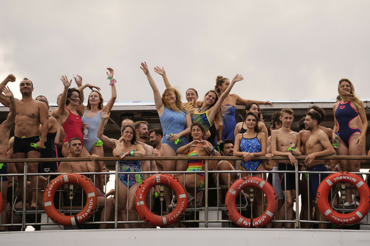 [이스탄불=AP/뉴시스] 24일(현지 시간) 튀르키예 이스탄불에서 열린 '보스포루스 해협 횡단 수영 대회' 참가자들이 출발 지점으로 향하는 페리를 타고 가면서 환호하고 있다. 참가자들은 아시아 측에서 유럽 측으로 수영하는 6.5㎞ 코스를 수영한다. 2025.08.25.