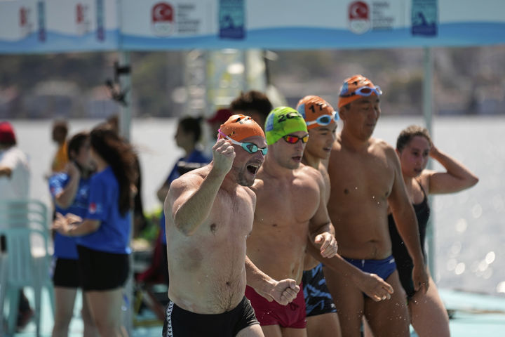 [이스탄불=AP/뉴시스] 24일(현지 시간) 튀르키예 이스탄불에서 열린 '보스포루스 해협 횡단 수영 대회' 참가자들이 아시아 측에서 유럽 측으로 수영하는 6.5㎞ 코스 경기를 마친 뒤 환호하고 있다. 2025.08.25.