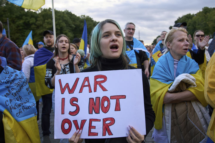 [베를린=AP/뉴시스] 24일(현지 시간) 독일 베를린에서 우크라이나 독립기념일을 맞아 연대 집회가 열려 참가자들이 구호를 외치고 있다. 우크라이나는 러시아와 4년째 전쟁을 치르는 가운데 독립 34주년을 맞았다. 2025.08.25.