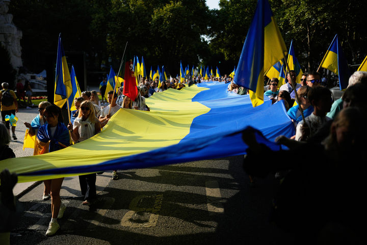 [리스본=AP/뉴시스] 24일(현지 시간) 포르투갈 리스본에서 우크라이나 독립기념일을 맞아 연대 집회가 열려 참가자들이 대형 우크라이나 국기를 들고 행진하고 있다. 우크라이나는 러시아와 4년째 전쟁을 치르는 가운데 독립 34주년을 맞았다. 2025.08.25.