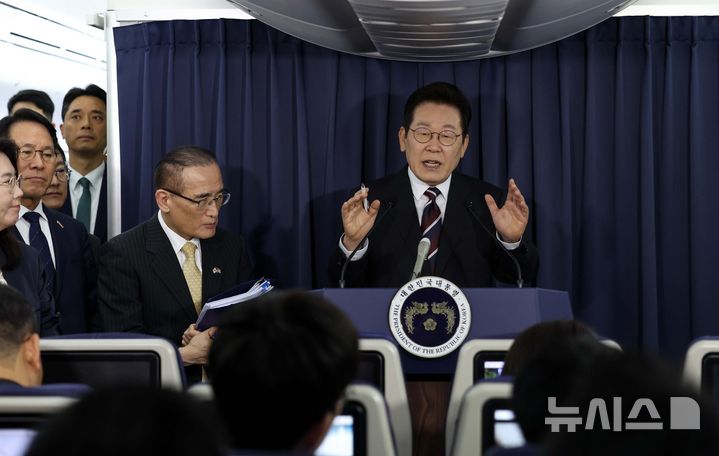 [워싱턴=뉴시스] 고범준 기자 = 이재명 대통령이 24일(현지 시간) 한일정상회담을 마치고 일본 도쿄에서 미국 워싱턴DC로 향하는 공군1호기에서 기내 기자간담회를 하고 있다. 2025.08.25. [email protected]