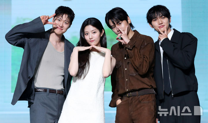 [서울=뉴시스] 김혜진 기자 = 배우 공명(왼쪽부터), 신은수, 차우민, 윤상현이 25일 오전 서울 마포구 호텔 나루에서 열린 넷플릭스 영화 '고백의 역사' 제작발표회에서 포즈를 취하고 있다.