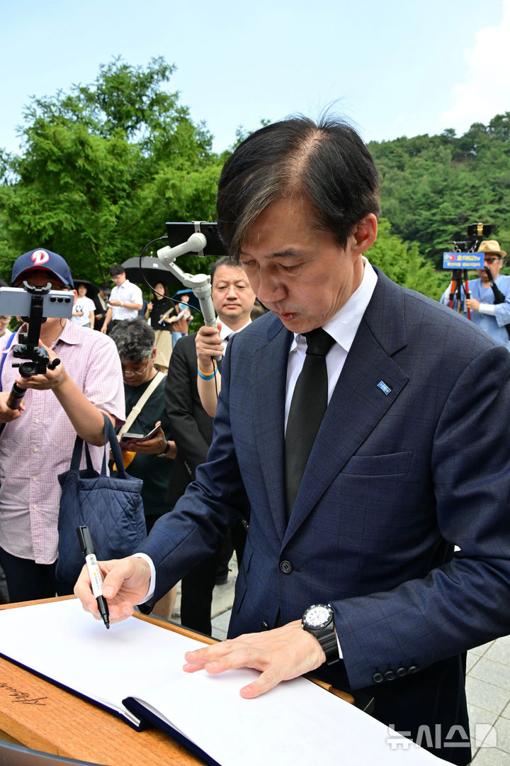 [김해=뉴시스] 차용현 기자 = 25일 오전 조국 전 조국혁신당 대표가 경남 김해시 봉화마을 고 노무현 전 대통령 묘역을 찾아 참배한 후 방명록을 작성하고 있다. [email protected]