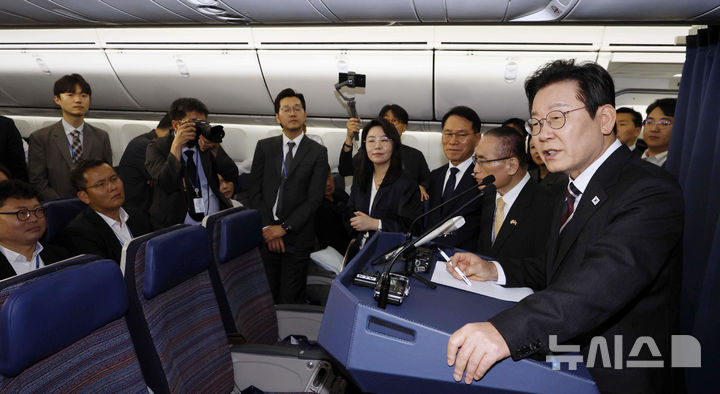 [워싱턴=뉴시스] 고범준 기자 = 이재명 대통령이 24일(현지 시간) 한일정상회담을 마치고 일본 도쿄에서 미국 워싱턴DC로 향하는 공군1호기에서 기내 기자간담회를 하고 있다. 2025.08.25. [email protected]
