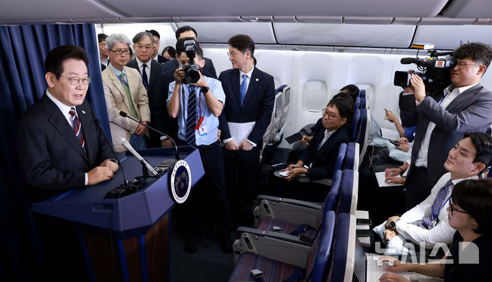 [워싱턴=뉴시스] 고범준 기자 = 이재명 대통령이 24일(현지 시간) 한일정상회담을 마치고 일본 도쿄에서 미국 워싱턴DC로 향하는 공군1호기에서 기내 기자간담회를 하고 있다. 2025.08.25. [email protected]