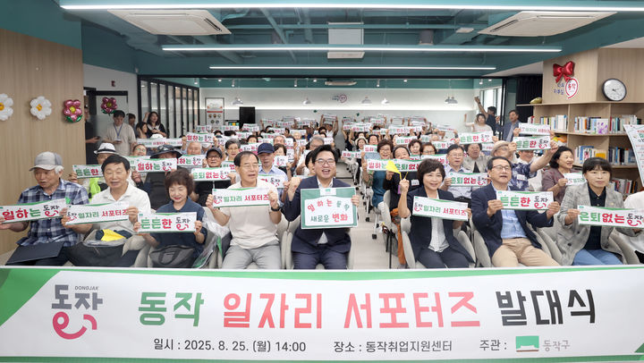 [서울=뉴시스] 박일하 동작구청장이 25일 서울 동작구 노량진동 동작취업센터에서 열린 '동작 일자리 서포터즈' 발대식에서 참석자들과 기념촬영 하고 있다. (사진=동작구 제공) 2025.08.25. [email protected] *재판매 및 DB 금지