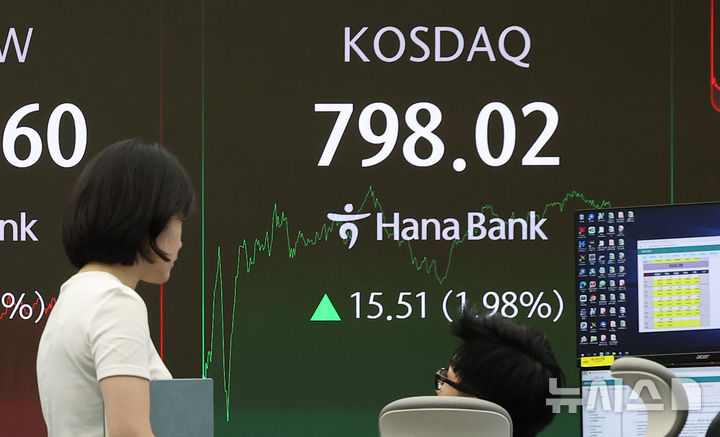 [서울=뉴시스] 김선웅 기자 = 코스닥 지수가 전 거래일(782.51)보다 15.51포인트(1.98%) 상승한 798.02에 거래를 마친 25일 오후 서울 중구 하나은행 본점 딜링룸에서 딜러들이 업무를 수행하고 있다. 2025.08.25. [email protected]