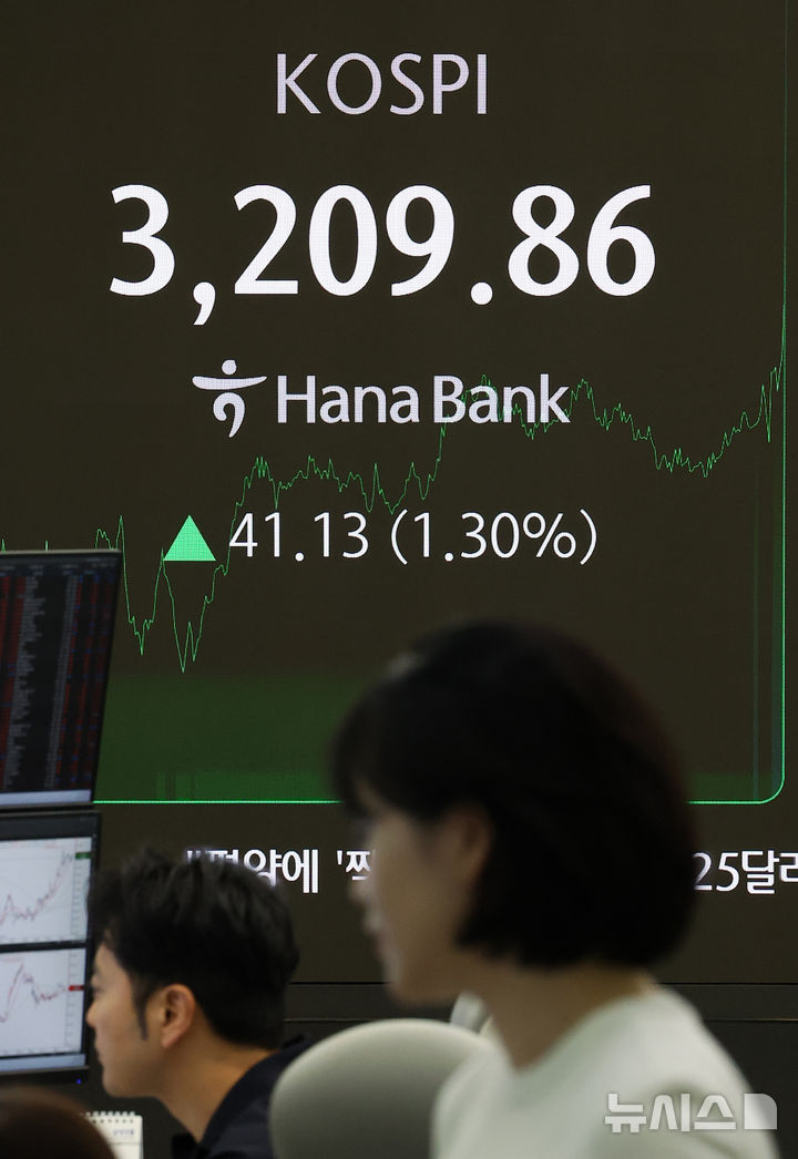 [서울=뉴시스] 김선웅 기자 = 코스피가 전 거래일(3168.73)보다 41.13포인트(1.30%) 오른 3209.86에 거래를 마친 25일 오후 서울 중구 하나은행 본점 딜링룸에서 딜러들이 업무를 수행하고 있다. 2025.08.25. [email protected]