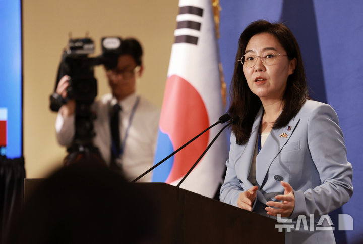 [워싱턴=뉴시스] 고범준 기자 = 강유정 대변인이 25일(현지 시간) 미국 워싱턴D.C 프레스센터 내 중앙기자실에서 정상회담 및 방미일정 관련 브리핑을 마치고 기자들 질문에 답하고 있다. 2025.08.25. [email protected]