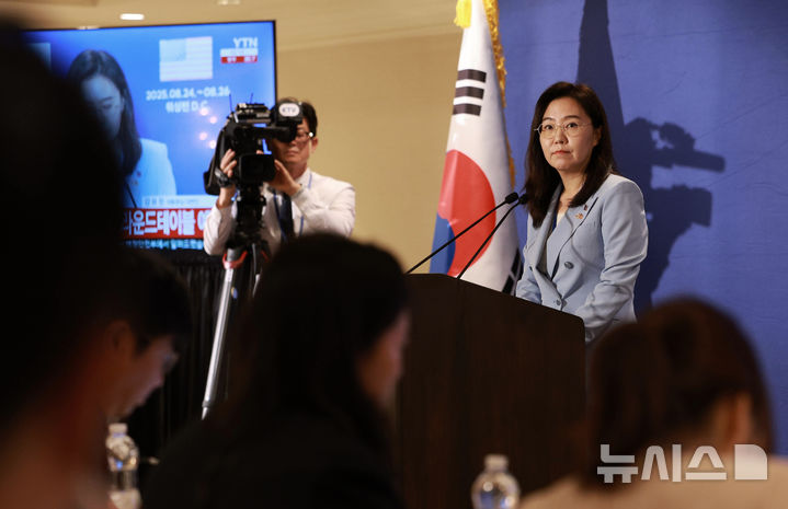 [워싱턴=뉴시스] 고범준 기자 = 강유정 대변인이 25일(현지 시간) 미국 워싱턴D.C 프레스센터 내 중앙기자실에서 정상회담 및 방미일정 관련 브리핑을 마치고 기자들 질문을 듣고 있다. 2025.08.25. [email protected]