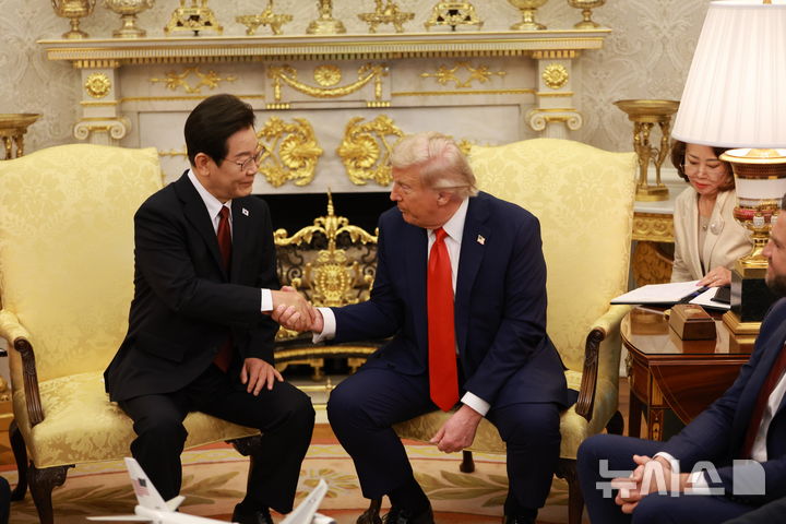 [워싱턴=뉴시스] 고범준 기자 = 이재명 대통령과 도널드 트럼프 미국 대통령이 25일(현지 시간) 미국 워싱턴DC 백악관에서 한미 정상회담을 하고 있다. 2025.08.26. [email protected]