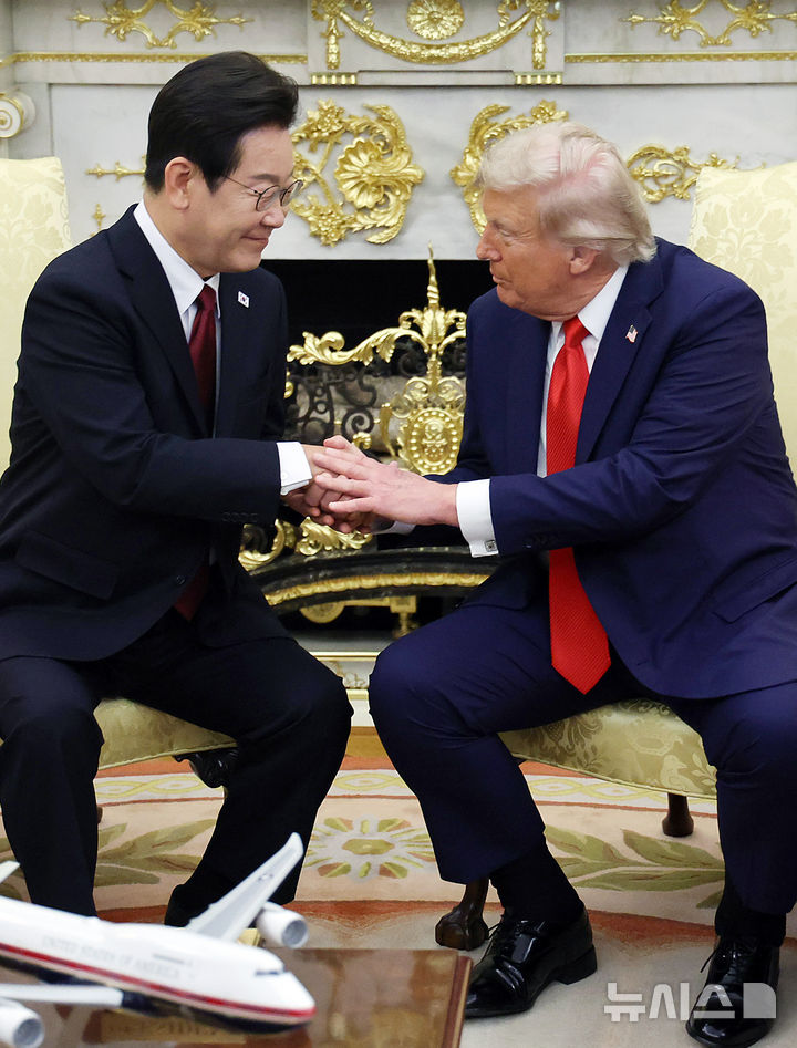 [워싱턴=뉴시스] 고범준 기자 = 이재명 대통령과 도널드 트럼프 미국 대통령이 25일(현지 시간) 미국 워싱턴DC 백악관에서 한미 정상회담을 하며 악수하고 있다. 2025.08.26. [email protected]