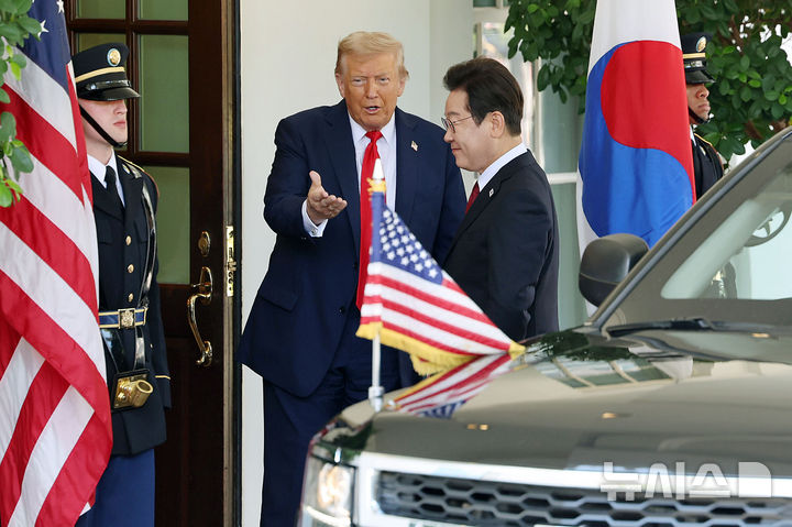 [워싱턴=뉴시스] 고범준 기자 = 도널드 트럼프 미국 대통령이 25일(현지 시간) 한미 정상회담을 위해 미국 워싱턴DC 백악관을 방문한 이재명 대통령을 영접하고 있다 . 2025.08.26. [email protected]