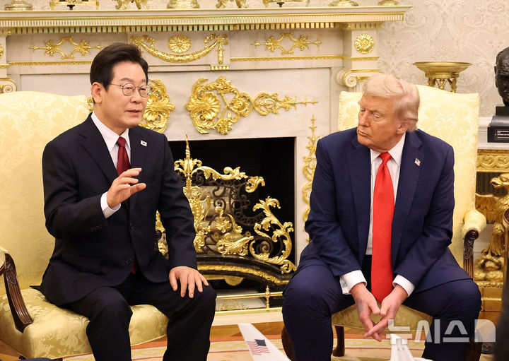 [워싱턴=뉴시스] 고범준 기자 = 이재명 대통령과 도널드 트럼프 미국 대통령이 25일(현지 시간) 미국 워싱턴DC 백악관에서 한미 정상회담을 하고 있다. 2025.08.26. [email protected]
