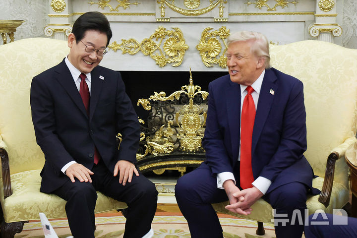 [워싱턴=뉴시스] 고범준 기자 = 이재명 대통령과 도널드 트럼프 미국 대통령이 25일(현지 시간) 미국 워싱턴DC 백악관에서 한미 정상회담 중 밝게 웃고 있다. 2025.08.26. [email protected]