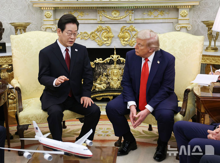 [워싱턴=뉴시스] 고범준 기자 = 이재명 대통령과 도널드 트럼프 미국 대통령이 25일(현지 시간) 미국 워싱턴DC 백악관에서 한미 정상회담을 하고 있다. 2025.08.26. [email protected]