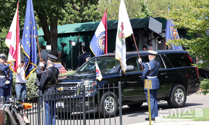 [워싱턴=뉴시스] 고범준 기자 = 이재명 대통령이 탑승한 차량이 25일(현지 시간) 미국 워싱턴DC 백악관으로 들어오고 있다. 이날 도널드 트럼프 미국 대통령과 한미 정상회담을 한다. 2025.08.26. [email protected]