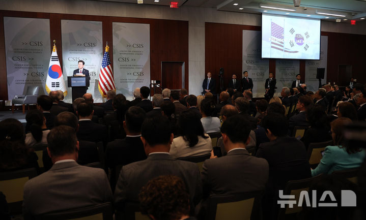 [워싱턴=뉴시스] 고범준 기자 = 이재명 대통령이 25일(현지 시간) 미국 워싱턴DC 전략국제문제연구소(CSIS)에서 정책 연설을 하고 있다. 2025.08.26. [email protected]