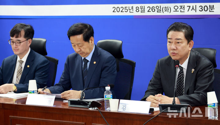 [서울=뉴시스] 김금보 기자 = 김병기(오른쪽) 더불어민주당 원내대표가 26일 오전 서울 여의도 국회 의원회관에서 열린 '더불어민주당 2026년 예산안 당정협의'에서 발언을 하고 있다. 가운데는 구윤철 경제부총리 겸 기획재정부 장관. 2025.08.26. [email protected]