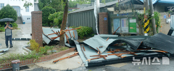 [전주=뉴시스] 김얼 기자 = 전북지역 곳곳이 호우경보와 산사태주의보가 내려질 만큼 많은 양의 비가 쏟아져 내린 26일 전북 전주시 덕진구 만성동에서 지붕이 떨어져 있다. 2025.08.26. [email protected]