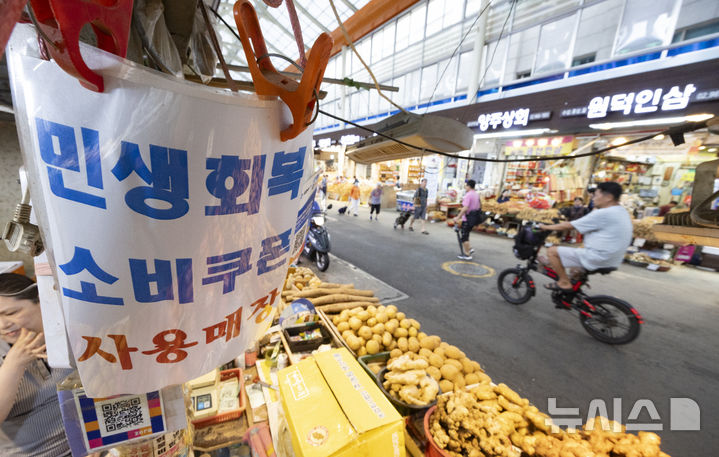 [서울=뉴시스] 김근수 기자 = 26일 서울 동대문구 청량리종합시장 내 점포 앞에 민생회복 소피쿠폰 사용 가능 안내문이 놓여 있다.