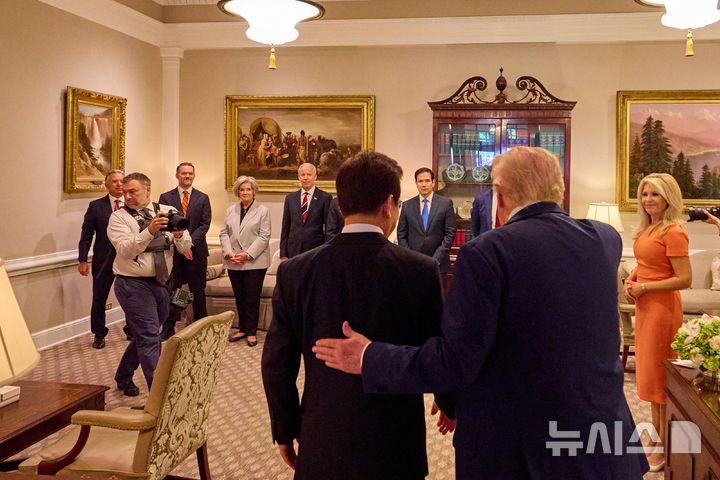 [워싱턴=뉴시스] 고범준 기자 = 이재명 대통령이 25일(현지 시간) 미국 워싱턴 DC 백악관에서 열린 한미 정상회담에 앞서 도널드 트럼프 미국 대통령의 안내를 받고 있다. (공동취재) 2025.08.26. [email protected]