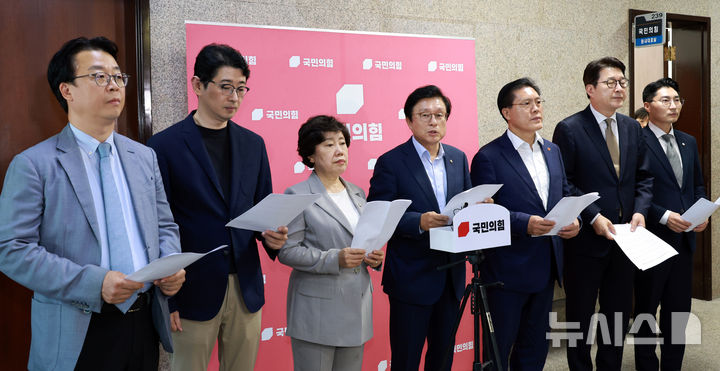 [서울=뉴시스] 김금보 기자 = 박형수 국회 법제사법위원회 국민의힘 간사 등 소속 위원들이 26일 오후 서울 여의도 국회에서 추미애 법사위원장의 위원회 운영을 일방적이라 주장하는 규탄성명을 발표 하고 있다. 2025.08.26. [email protected]