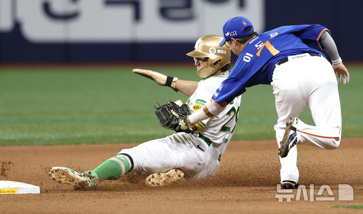 [서울=뉴시스] 정병혁 기자 = 26일 서울 구로구 고척스카이돔에서 열린 2025 KBO리그 한화 이글스와 키움 히어로즈의 경기, 4회말 2사 1루 상황 키움 김건희 타석 때 1루 주자 임지열이 2루 도루를 시도하다 아웃되고 있다. 2025.08.26. [email protected]