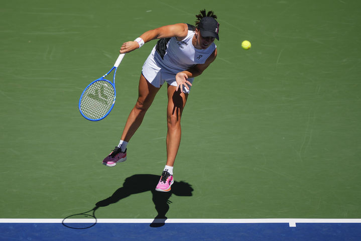 [뉴욕=AP/뉴시스] 이가 시비옹테크(2위·폴란드)가 26일(현지 시간) 미국 뉴욕의 빌리진킹 내셔널 테니스 센터에서 열린 US 오픈 여자 단식 1회전에서 에밀리아나 아랑고(84위·콜롬비아)와 경기하고 있다. 시비옹테크가 2-0(6-1 6-2)으로 승리하고 2회전에 올랐다. 2025.08.27.