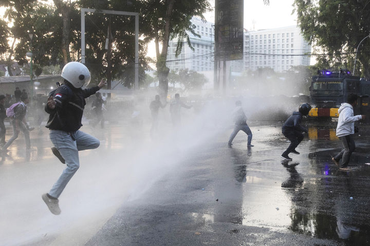 [메단=AP/뉴시스] 26일(현지 시간) 인도네시아 북수마트라 메단에서 국회의원들에게 지급되는 과도한 수당에 항의하는 시위대가 경찰이 쏘는 물대포를 맞고 있다. 인도네시아 정부가 지난해부터 국회의원들에게 월 5000만 루피아(약 430만 원)의 주택 수당을 지급한 사실이 알려지자 이에 반발하는 대규모 시위가 일어났다. 5000만 루피아는 인도네시아 빈곤 지역 월 최저임금의 약 20배에 달하는 액수다. 2025.08.27.