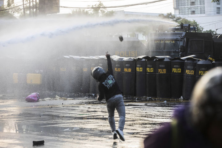 경찰 향해 돌 던지는 인도네시아 시위 참가자