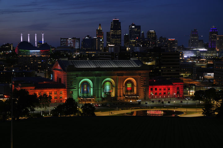 [캔자스시티=AP/뉴시스] 26일(현지 시간) 미 미주리주 캔자스시티의 유니언역 역사가 가수 테일러 스위프트와 미국프로풋볼(NFL) 캔자스시티 치프스 트래비스 켈스의 약혼을 축하하는 특정 색상의 조명으로 물들어 있다. 주황색과 민트색은 스위프트를, 빨간색과 금색은 켈스를 상징한다. 2025.08.27.