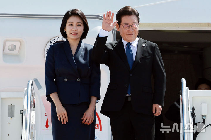 [워싱턴=뉴시스] 고범준 기자 = 이재명 대통령과 김혜경 여사가 26일(현지 시간) 워싱턴DC 앤드루스 공군기지에서 필라델피아로 출발하기 위해 공군 1호기에 탑승하며 인사하고 있다. 2025.08.27. [email protected]