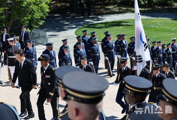 [워싱턴=뉴시스] 고범준 기자 = 이재명 대통령이 26일(현지 시간) 워싱턴DC 인근 알링턴 국립묘지를 참배하기 위해 이동하고 있다. 2025.08.27. [email protected]