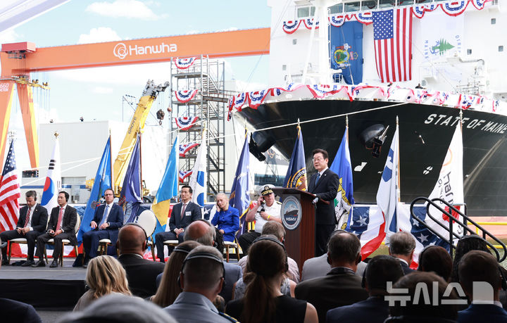 [필라델피아=뉴시스] 고범준 기자 = 이재명 대통령이 26일(현지 시간) 필라델피아 한화 필리조선소에서 열린 미국 해양청 발주 국가안보 다목적선 '스테이트 오브 메인'호의 명명식에서 축사를 하고 있다. 2025.08.27. [email protected]