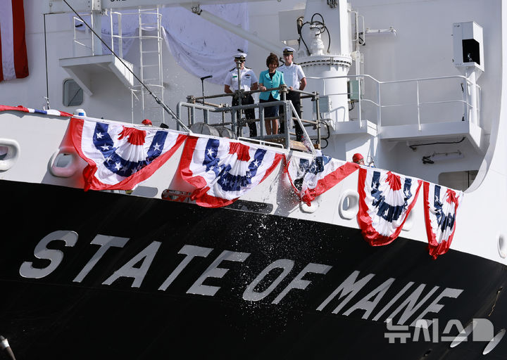 [필라델피아=뉴시스] 고범준 기자 = 26일(현지 시간) 필라델피아 한화 필리조선소에서 열린 미국 해양청 발주 국가안보 다목적선 '스테이트 오브 메인'호 명명식에서 일레인 차오 전 미국 노동부 장관이 샴페인 브레이킹을 하고 있다. 2025.08.27. [email protected]