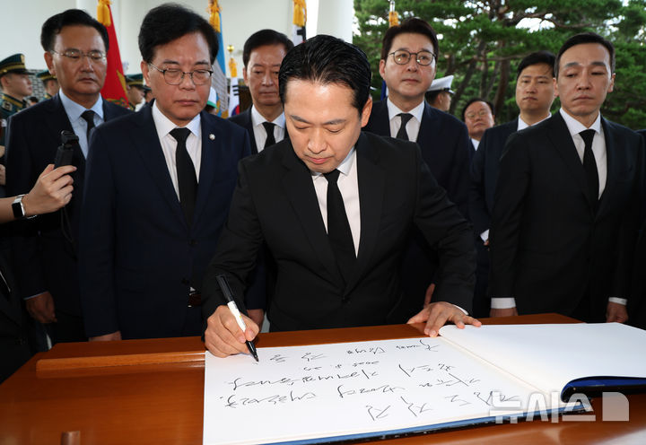 [서울=뉴시스] 홍효식 기자 = 장동혁 국민의힘 신임 대표가 27일 오전 서울 동작구 국립서울현충원을 찾아 참배를 마친 뒤 방명록을 작성하고 있다. 2025.08.27. [email protected]