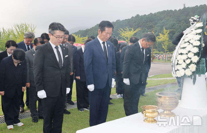 [대전=뉴시스] 김명년 기자 = 정청래 더불어민주당 대표가 27일 대전 유성구 국립대전현충원 홍범도 장군 묘역을 찾아 참배하고 있다.(공동취재) 2025.08.27. [email protected]