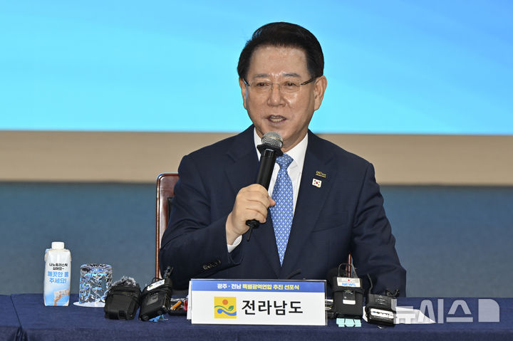[나주=뉴시스] 박기웅 기자 = 27일 오전 전남 나주시청 대회의실에서 열린 광주·전남 특별광역연합 추진 선포식에서 김영록 전남도지사가 인사말을 하고 있다. 2025.08.27. [email protected]