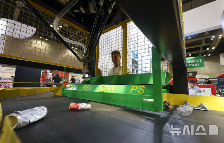 [고양=뉴시스] 홍효식 기자 = 27일 경기 고양시 일산서구 킨텍스 제2전시장에서 열린 제18회 폐기물·자원순환산업전 및 차세대 분체산업전에서 인공지능 폐기물 선별로봇이 시연되고 있다. 2025.08.27. [email protected]