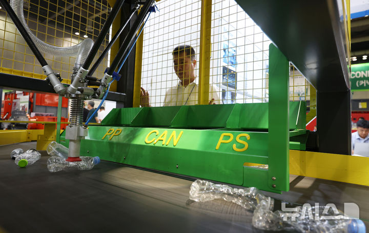 [고양=뉴시스] 홍효식 기자 = 27일 경기 고양시 일산서구 킨텍스 제2전시장에서 열린 제18회 폐기물·자원순환산업전 및 차세대 분체산업전에서 인공지능 폐기물 선별로봇이 시연되고 있다. 2025.08.27. [email protected]