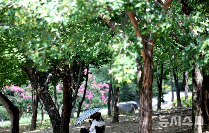 [대구=뉴시스] 이무열 기자 = 폭염이 연일 계속되고 있는 27일 대구 달서구 두류공원 나무그늘 아래서 한 시민이 더위를 식히고 있다. 2025.08.27. [email protected]
