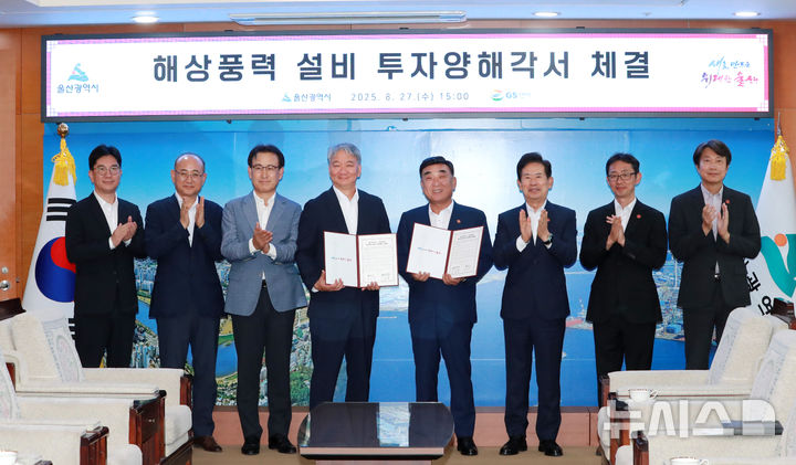 [울산=뉴시스] 배병수 기자 = 김두겸(왼쪽 다섯번째) 울산시장은 27일 오후 시청 본관 7층 시장실에서 정용한(왼쪽 네번째) GS엔텍 대표와 해상풍력 설비 투자협약을 체결한 뒤 참석자들과 기념촬영을 하고 있다.(사진=울산시 제공). [email protected].