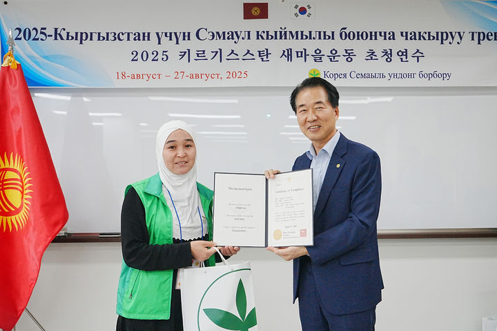 [서울=뉴시스] 조성우 기자 = 김성호 새마을운동중앙회 사무총장이 27일 경기도 성남시 새마을운동중앙회에서 열린 키르기스스탄 초청 새마을교육 수료식에서 연수생에게 수료증을 전달하고 있다. (사진=새마을운동중앙회 제공) 2025.08.27. [email protected] *재판매 및 DB 금지