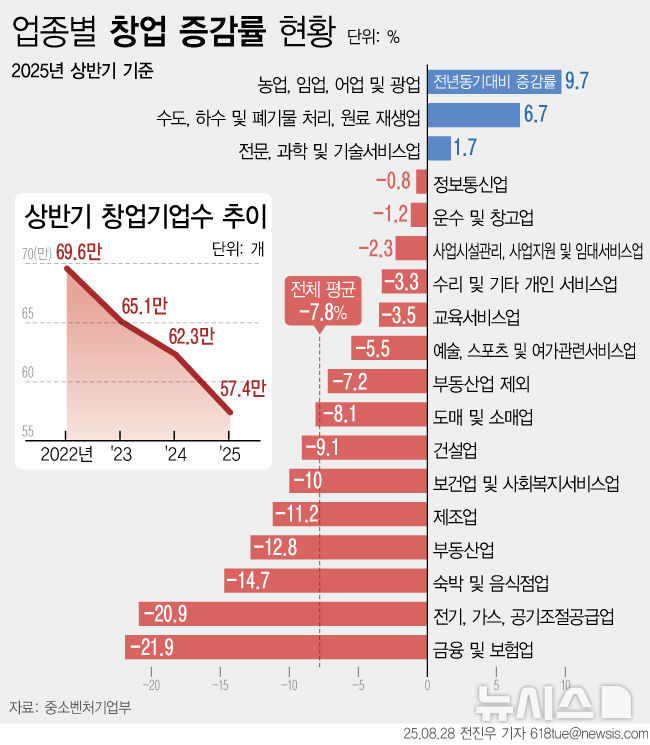 [서울=뉴시스] 28일 중소벤처기업부에 따르면 상반기 창업기업수는 전년동기대비 7.8%(4만8359개) 감소한 57만4401개로 60만개에 못 미친 것으로 나타났다. 도매·소매업, 숙박·음식점업, 부동산업 창업이 줄면서 전체적인 수치가 작년에 비해 감소했다. (그래픽=전진우 기자)