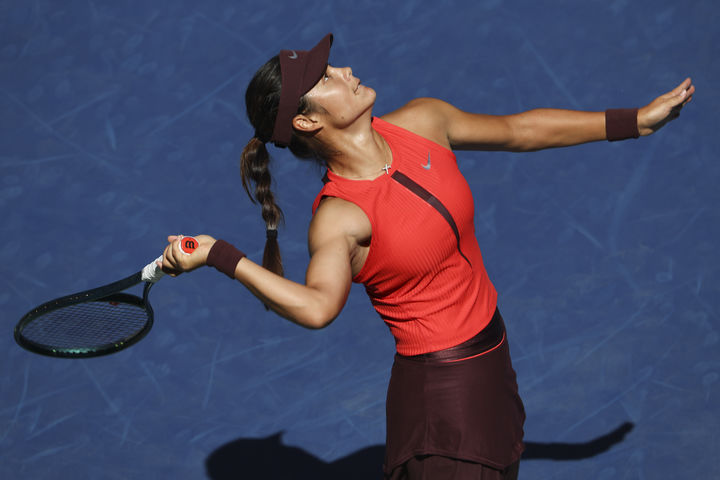 [뉴욕=AP/뉴시스] 에마 라두카누(36위·영국)가 27일(현지 시간) 미국 뉴욕의 빌리진킹 내셔널 테니스 센터에서 열린 US 오픈 여자 단식 2회전에서 재니스 첸(149위·인도네시아)과 경기하고 있다. 라두카누가 2-0(6-2 6-1)로 승리하고 3회전에 올랐다. 2025.08.28.