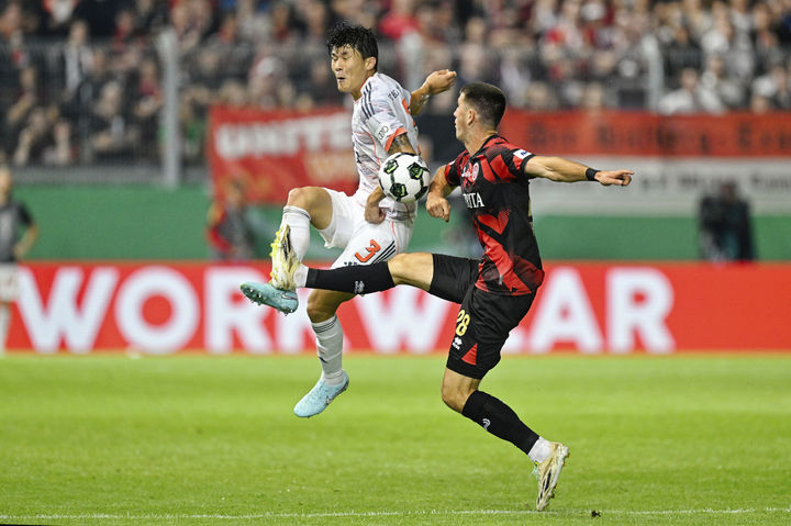 [비스바덴=AP/뉴시스] 바이에른 뮌헨의 김민재(왼쪽)가 27일(현지 시간) 독일 비스바덴의 브리타 아레나에서 열린 2025-26 독일축구협회(DFB) 포칼(독일컵) 1라운드 베헨 비스바덴(3부 리그)과 경기 중 공을 다투고 있다. 뮌헨이 3-2로 힘겹게 승리했다. 2025.08.28.